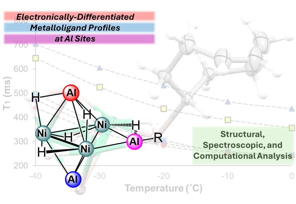 In this work, we report a Ni–Al cluster, complex 1, [LNiAl]₃H₅R (R = 4-cyclooctenyl), that brings several of these Al modalities together within a single, well-defined structure. The cluster features electronically distinct Al and Al-hydride units capping a trinickel core, enabling the explicit characterization of the Al centers as sigma-donor, sigma-acceptor, and aluminyl/aluminylene modalities, Figure 1. This unique arrangement in 1 enables direct comparison and distinction using structural, spectroscopic, and computational comparison. In addition, we were able to utilize spin-lattice relaxation times in NMR spectroscopy to further distinguish the Al-base ligand modalities spectroscopically, a technique that had traditionally been used to differentiate metal-dihydrogen complexes from metal-hydrides.